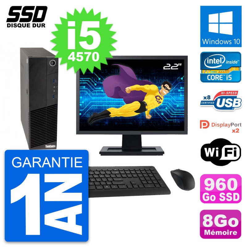 PC Lenovo ThinkCentre M83 SFF - Intel Core i5-4570 3.2 Ghz (6 Mo) - 8 Go DDR3 - SSD 960 Go - Clef Wifi USB - Windows 10 - Livré avec Ecran 22" + clavier + souris (Marques et modèles variables) - Garantie 1 an.