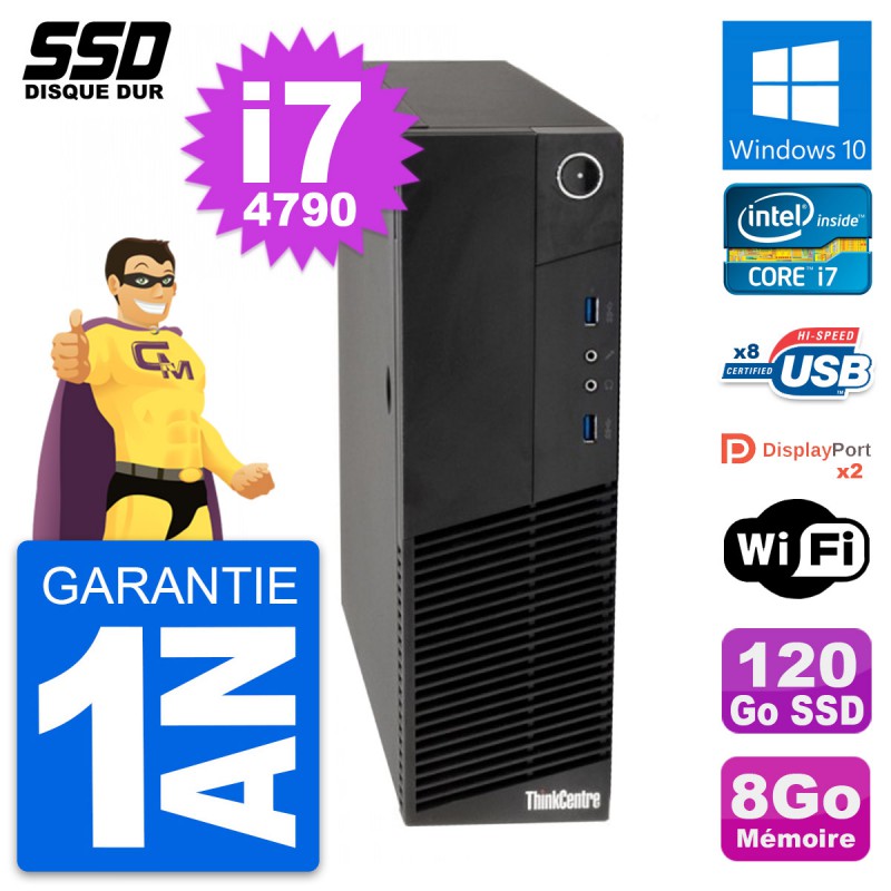 PC Lenovo ThinkCentre M83 SFF - Intel Core i7-4790 3.6 Ghz (8 Mo) - 8 Go DDR3 - SSD 120 Go - Clef Wifi USB - Windows 10 - Garantie 1 an.