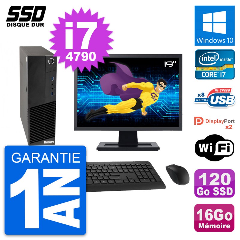 PC Lenovo ThinkCentre M83 SFF - Intel Core i7-4790 3.6 Ghz (8 Mo) - 16 Go DDR3 - SSD 120 Go - Clef Wifi USB - Windows 10 - Livré avec Ecran 19" + clavier + souris (Marques et modèles variables) - Garantie 1 an.