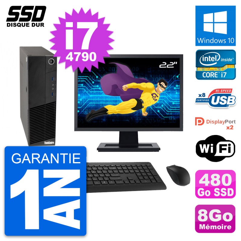 PC Lenovo ThinkCentre M83 SFF - Intel Core i7-4790 3.6 Ghz (8 Mo) - 8 Go DDR3 - SSD 480 Go - Clef Wifi USB - Windows 10 - Livré avec Ecran 22" + clavier + souris (Marques et modèles variables) - Garantie 1 an.