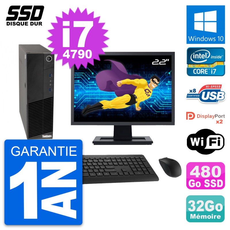 PC Lenovo ThinkCentre M83 SFF - Intel Core i7-4790 3.6 Ghz (8 Mo) - 32 Go DDR3 - SSD 480 Go - Clef Wifi USB - Windows 10 - Livré avec Ecran 22" + clavier + souris (Marques et modèles variables) - Garantie 1 an.