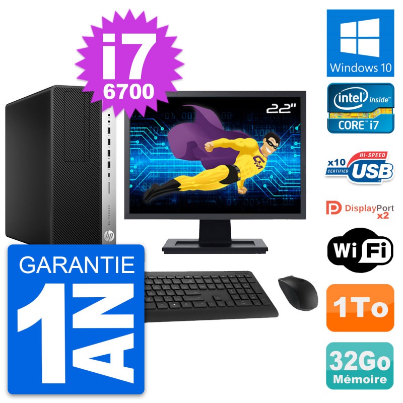 PC Tour HP EliteDesk 800 G3 MT - Intel Core i7-6700 3.4 Ghz (8 Mo) - 32 Go DDR4 - Disque Dur 3,5" 1 To - Clef Wifi USB - Windows 10 - Livré avec Ecran 22" + clavier + souris (Marques et modèles variables) - Garantie 1 an.