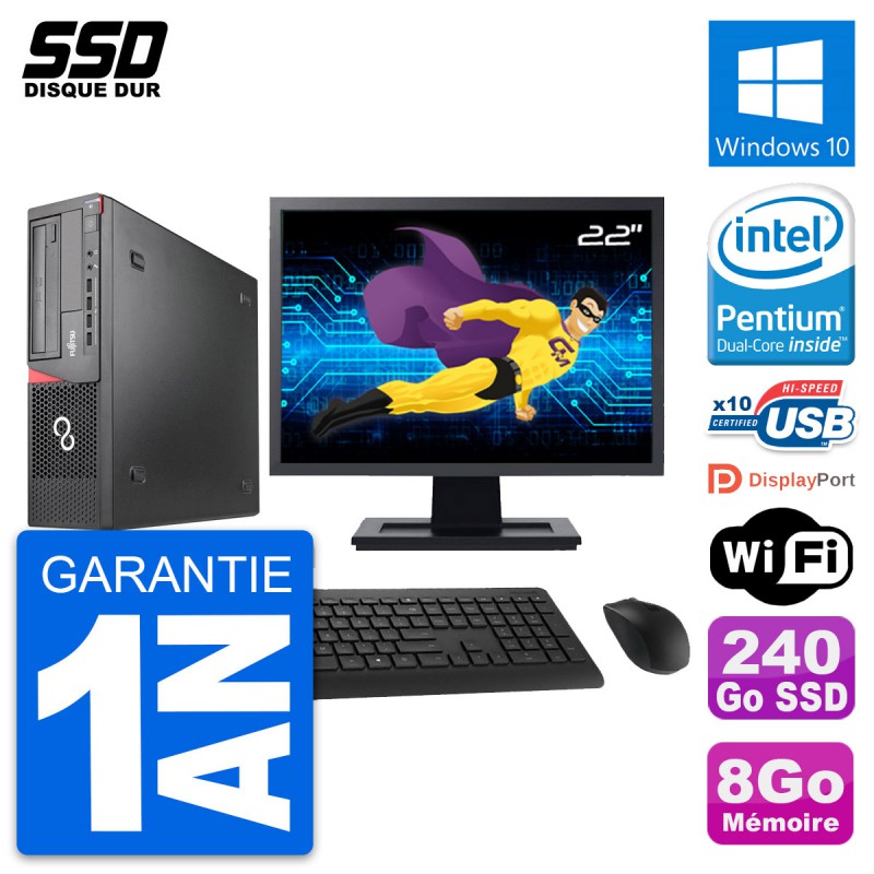 PC Fujitsu Esprimo E920 DT - Intel Pentium Dual-Core G3220 3.0 Ghz (3 Mo) - 8 Go DDR3 - SSD 240 Go - Graveur DVD - Clef Wifi USB - Windows 10 - Livré avec Ecran 22" + clavier + souris (Marques et modèles variables) - Garantie 1 an.