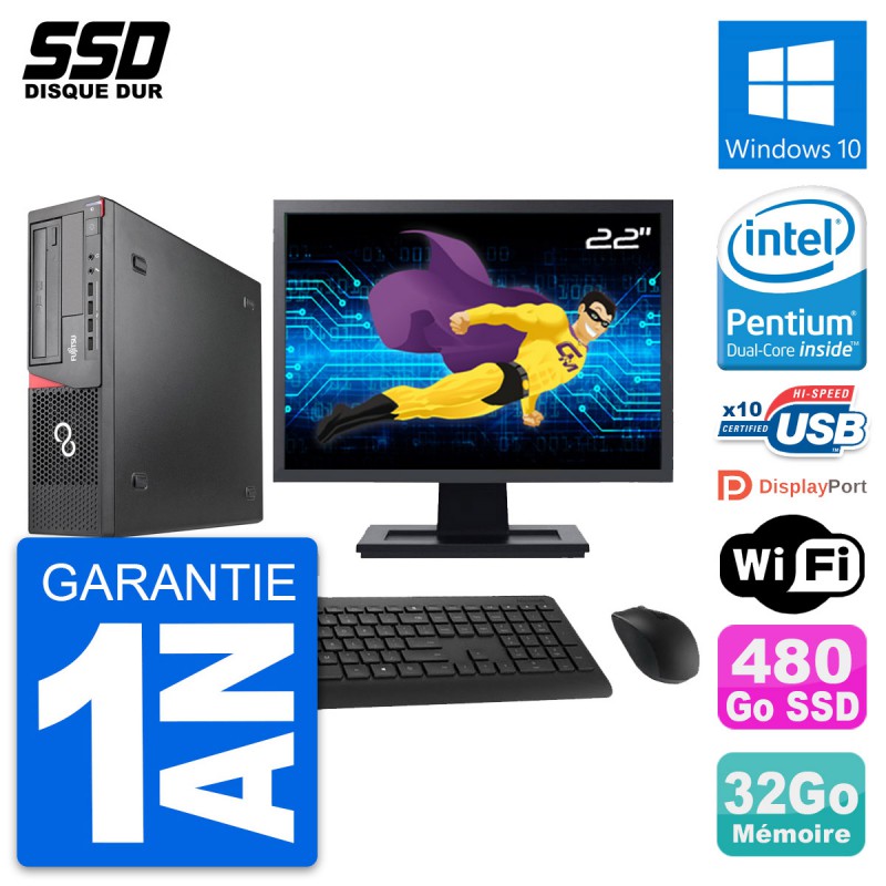 PC Fujitsu Esprimo E920 DT - Intel Pentium Dual-Core G3220 3.0 Ghz (3 Mo) - 32 Go DDR3 - SSD 480 Go - Graveur DVD - Clef Wifi USB - Windows 10 - Livré avec Ecran 22" + clavier + souris (Marques et modèles variables) - Garantie 1 an.