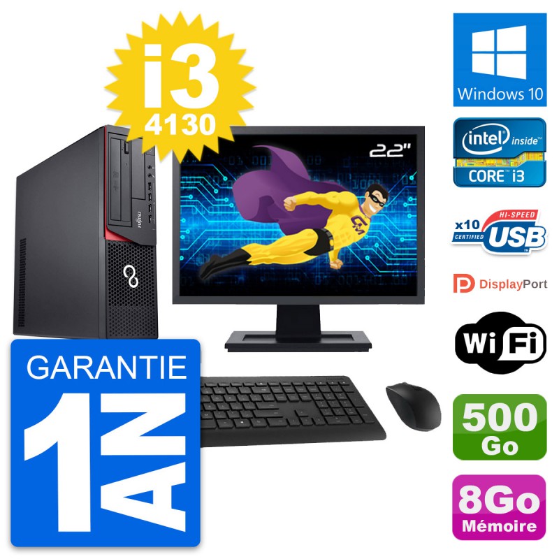 PC Fujitsu Esprimo E920 DT - Intel Core i3-4130 3.4 Ghz (3 Mo) - 8 Go DDR3 - Disque Dur 3,5" 500 Go - Graveur DVD - Clef Wifi USB - Windows 10 - Livré avec Ecran 22" + clavier + souris (Marques et modèles variables) - Garantie 1 an.