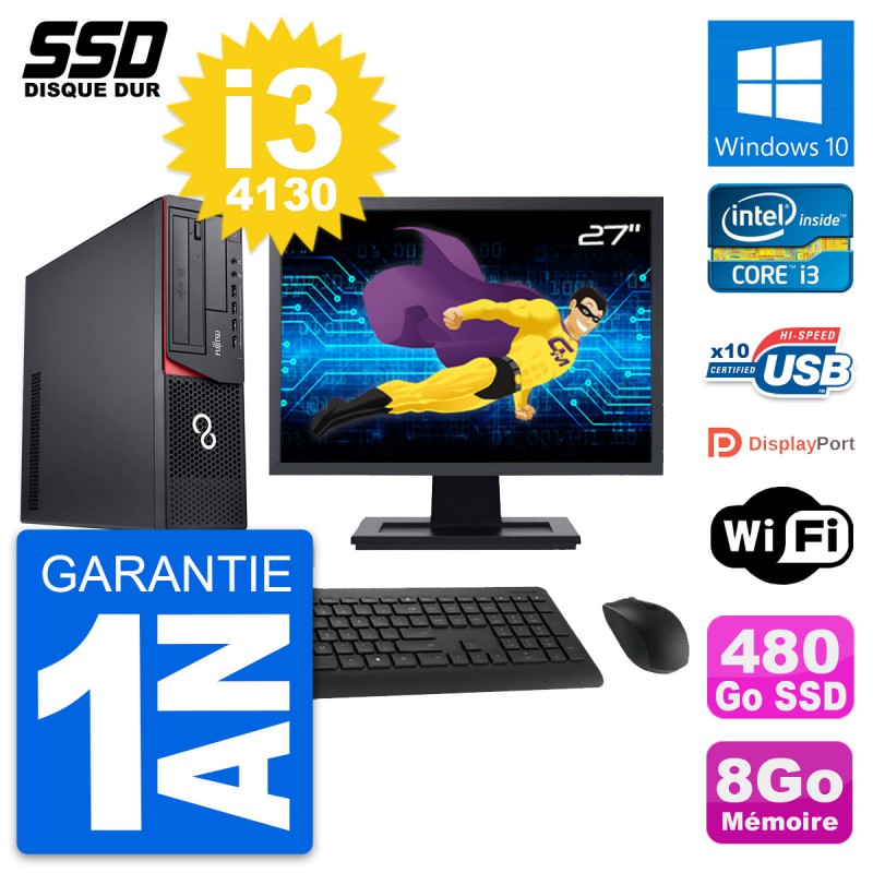 PC Fujitsu Esprimo E920 DT - Intel Core i3-4130 3.4 Ghz (3 Mo) - 8 Go DDR3 - SSD 480 Go - Graveur DVD - Clef Wifi USB - Windows 10 - Livré avec Ecran 27" + clavier + souris (Marques et modèles variables) - Garantie 1 an.