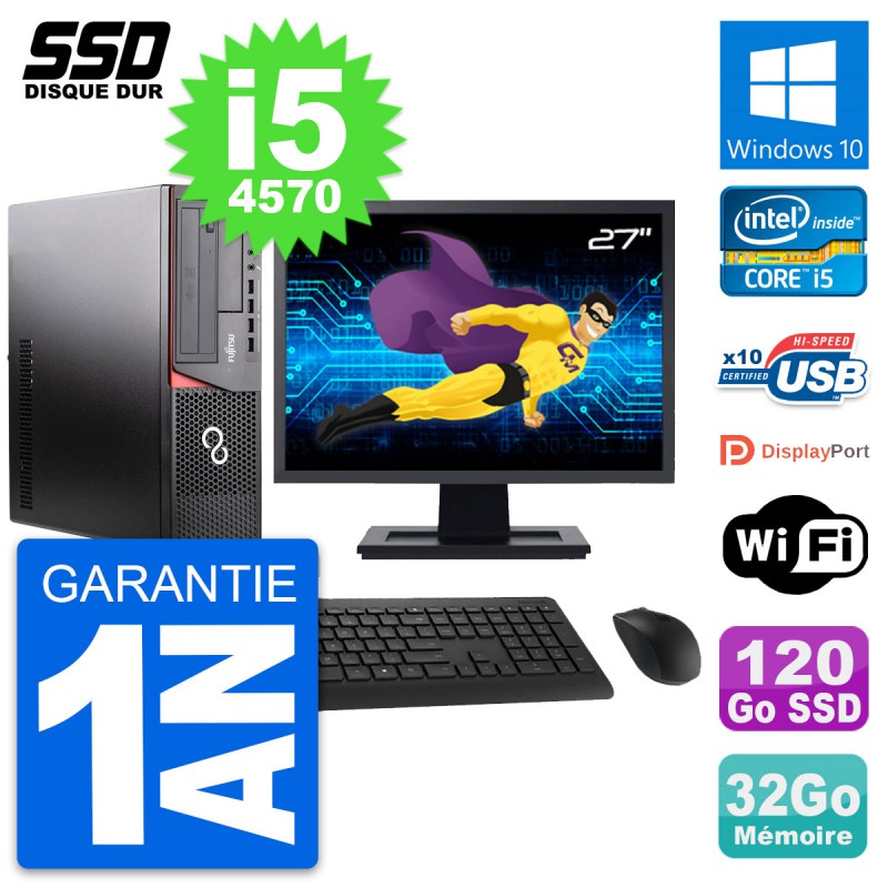 PC Fujitsu Esprimo E920 DT - Intel Core i5-4570 3.2 Ghz (6 Mo) - 32 Go DDR3 - SSD 120 Go - Graveur DVD - Clef Wifi USB - Windows 10 - Livré avec Ecran 27" + clavier + souris (Marques et modèles variables) - Garantie 1 an.