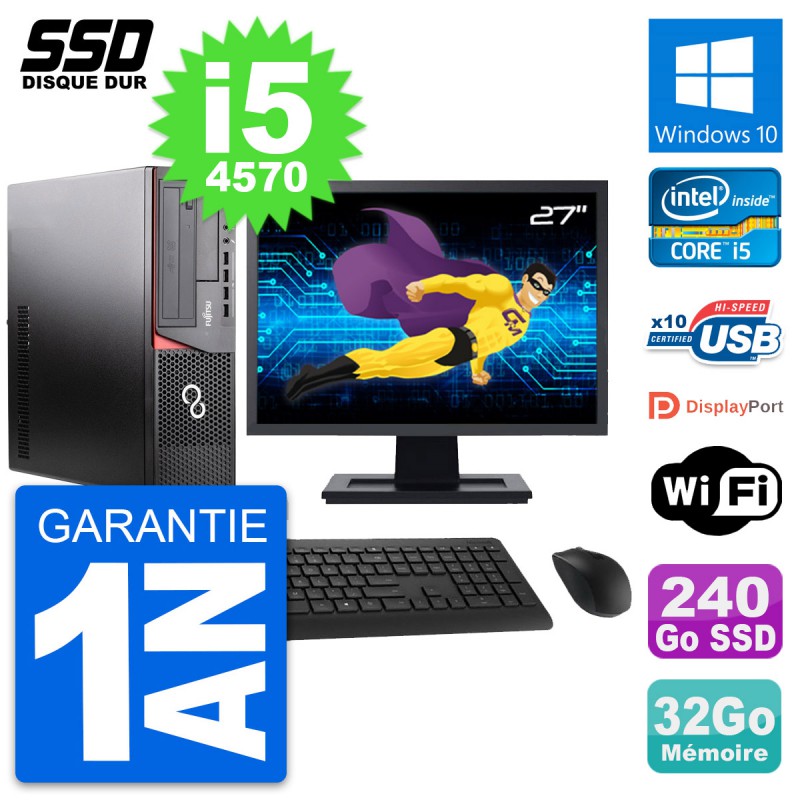 PC Fujitsu Esprimo E920 DT - Intel Core i5-4570 3.2 Ghz (6 Mo) - 32 Go DDR3 - SSD 240 Go - Graveur DVD - Clef Wifi USB - Windows 10 - Livré avec Ecran 27" + clavier + souris (Marques et modèles variables) - Garantie 1 an.