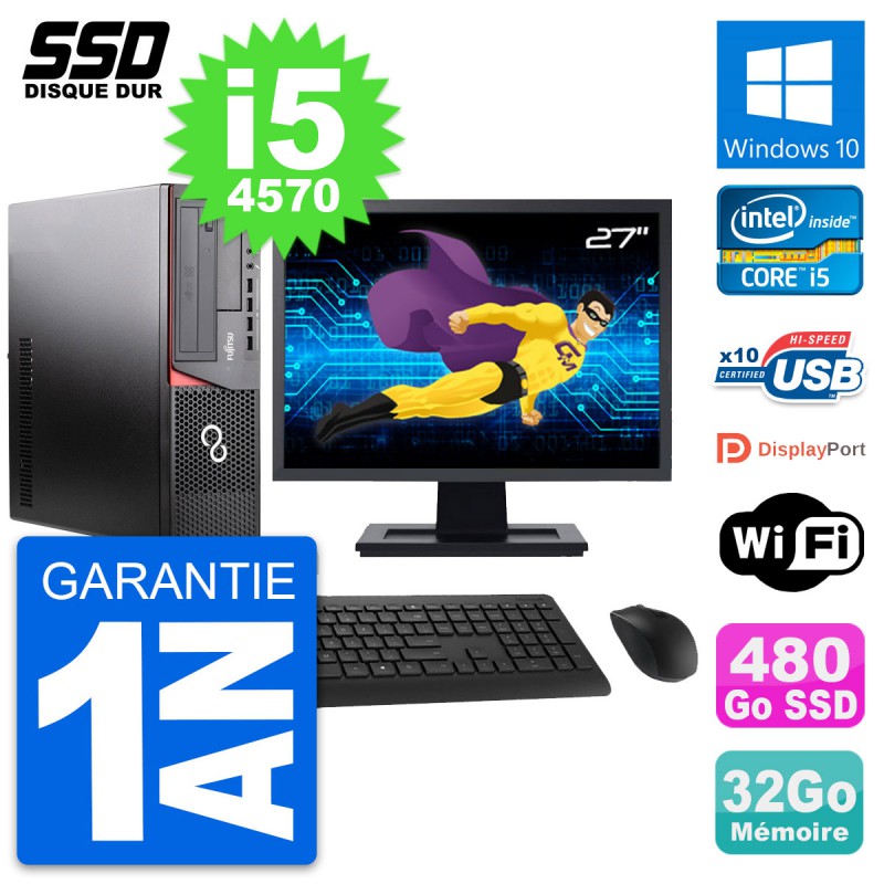 PC Fujitsu Esprimo E920 DT - Intel Core i5-4570 3.2 Ghz (6 Mo) - 32 Go DDR3 - SSD 480 Go - Graveur DVD - Clef Wifi USB - Windows 10 - Livré avec Ecran 27" + clavier + souris (Marques et modèles variables) - Garantie 1 an.