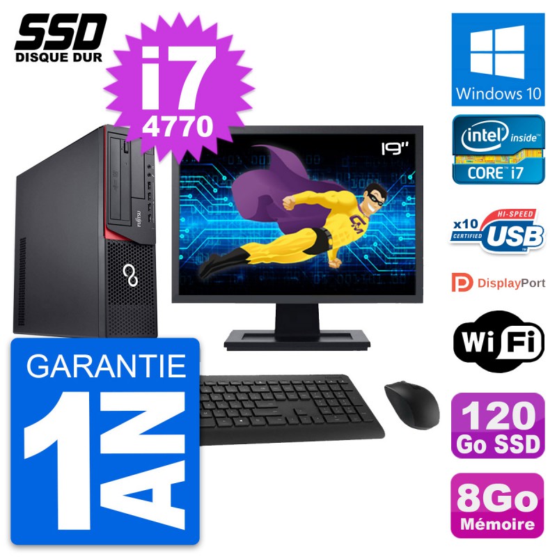 PC Fujitsu Esprimo E920 DT - Intel Core i7-4770 3.4 Ghz (8 Mo) - 8 Go DDR3 - SSD 120 Go - Graveur DVD - Clef Wifi USB - Windows 10 - Livré avec Ecran 19" + clavier + souris (Marques et modèles variables) - Garantie 1 an.