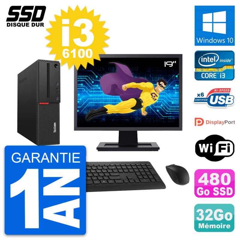 PC Lenovo ThinkCentre M700 SFF - Intel Core i3-6100 3.7 Ghz (3 Mo) - 32 Go DDR4 - SSD 480 Go - Clef Wifi USB - Windows 10 - Livré avec Ecran 19" + clavier + souris (Marques et modèles variables) - Garantie 1 an.