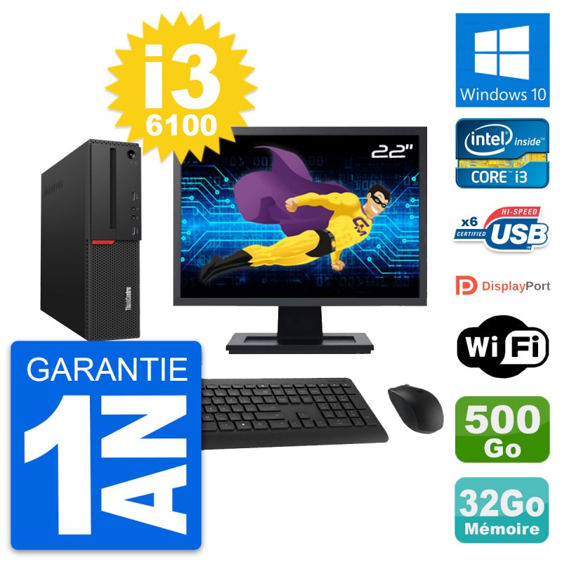 PC Lenovo ThinkCentre M700 SFF - Intel Core i3-6100 3.7 Ghz (3 Mo) - 32 Go DDR4 - Disque Dur 3,5" 500 Go - Clef Wifi USB - Windows 10 - Livré avec Ecran 22" + clavier + souris (Marques et modèles variables) - Garantie 1 an.
