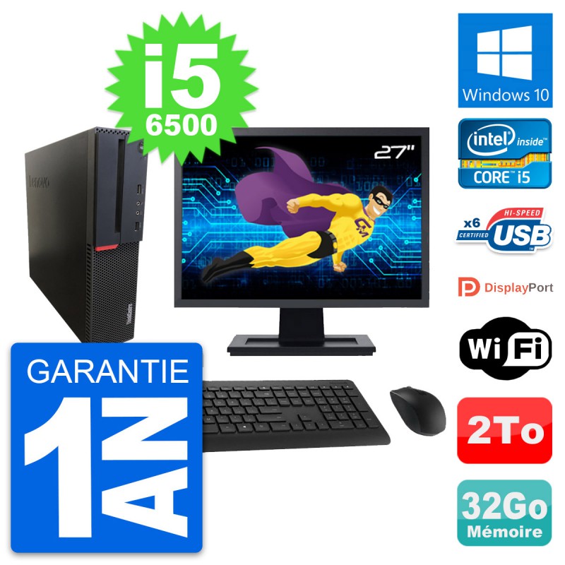 PC Lenovo ThinkCentre M700 SFF - Intel Core i5-6500 3.2 Ghz (6 Mo) - 32 Go DDR4 - Disque Dur 3,5" 2 To - Clef Wifi USB - Windows 10 - Livré avec Ecran 27" + clavier + souris (Marques et modèles variables) - Garantie 1 an.