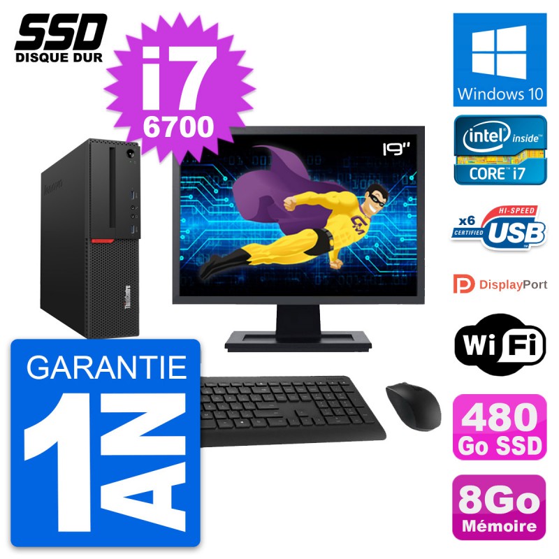 PC Lenovo ThinkCentre M700 SFF - Intel Core i7-6700 3.4 Ghz (8 Mo) - 8 Go DDR4 - SSD 480 Go - Clef Wifi USB - Windows 10 - Livré avec Ecran 19" + clavier + souris (Marques et modèles variables) - Garantie 1 an.