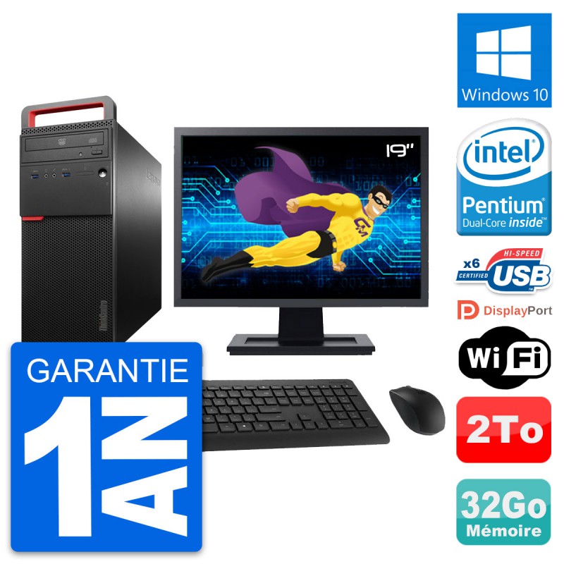 PC Tour Lenovo ThinkCentre M700 - Intel Pentium Dual-Core G4400 3.3 Ghz (3 Mo) - 32 Go DDR4 - Disque Dur 3,5" 2 To - Graveur DVD - Clef Wifi USB - Windows 10 - Livré avec Ecran 19" + clavier + souris (Marques et modèles variables) - Garantie 1 an.