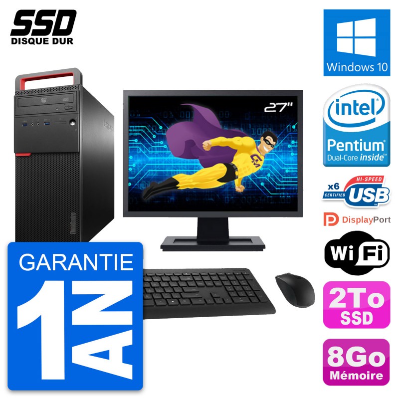 PC Tour Lenovo ThinkCentre M700 - Intel Pentium Dual-Core G4400 3.3 Ghz (3 Mo) - 8 Go DDR4 - SSD 2 To - Graveur DVD - Clef Wifi USB - Windows 10 - Livré avec Ecran 27" + clavier + souris (Marques et modèles variables) - Garantie 1 an.