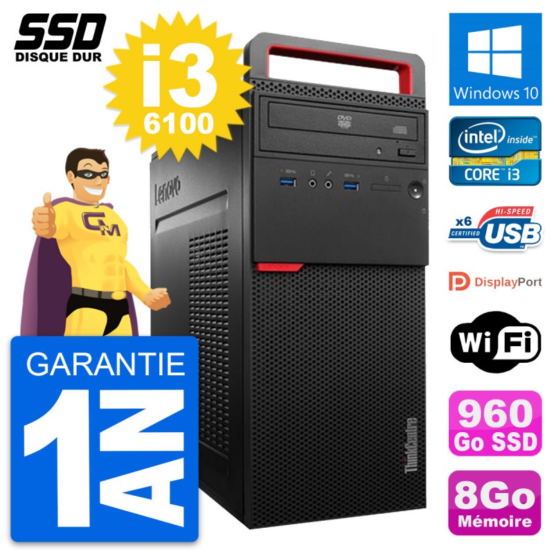 PC Tour Lenovo ThinkCentre M700 - Intel Core i3-6100 3.7 Ghz (3 Mo) - 8 Go DDR4 - SSD 960 Go - Graveur DVD - Clef Wifi USB - Windows 10 - Garantie 1 an.
