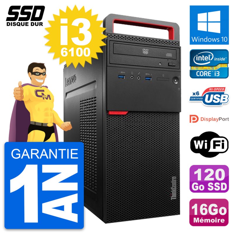 PC Tour Lenovo ThinkCentre M700 - Intel Core i3-6100 3.7 Ghz (3 Mo) - 16 Go DDR4 - SSD 120 Go - Graveur DVD - Clef Wifi USB - Windows 10 - Garantie 1 an.