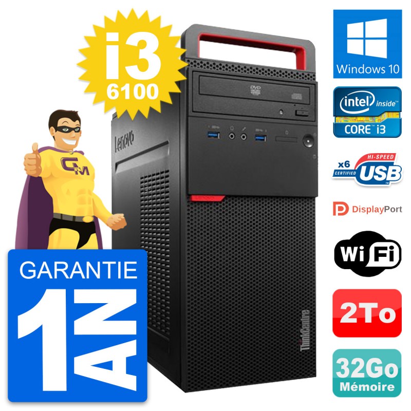 PC Tour Lenovo ThinkCentre M700 - Intel Core i3-6100 3.7 Ghz (3 Mo) - 32 Go DDR4 - Disque Dur 3,5" 2 To - Graveur DVD - Clef Wifi USB - Windows 10 - Garantie 1 an.