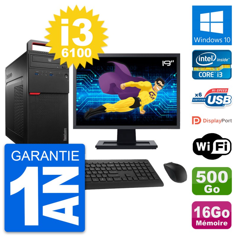 PC Tour Lenovo M700 Ecran 19" i3-6100 RAM 16Go Disque Dur 500Go Windows 10 Wifi
