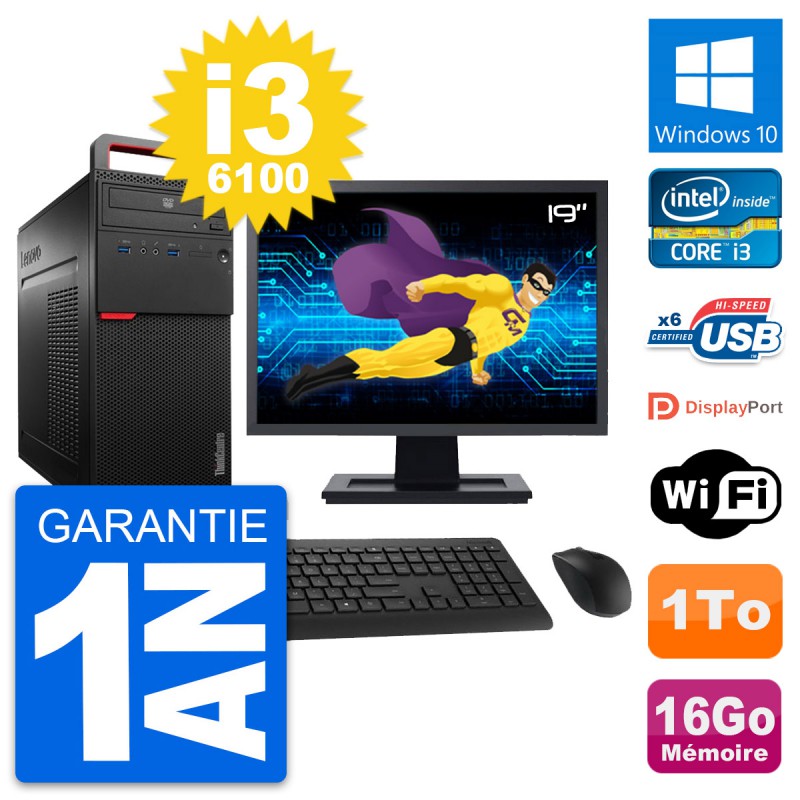 PC Tour Lenovo ThinkCentre M700 - Intel Core i3-6100 3.7 Ghz (3 Mo) - 16 Go DDR4 - Disque Dur 3,5" 1 To - Graveur DVD - Clef Wifi USB - Windows 10 - Livré avec Ecran 19" + clavier + souris (Marques et modèles variables) - Garantie 1 an.