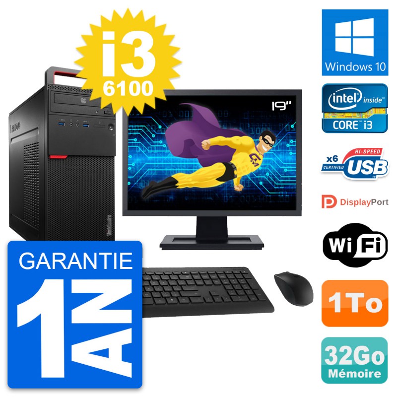 PC Tour Lenovo ThinkCentre M700 - Intel Core i3-6100 3.7 Ghz (3 Mo) - 32 Go DDR4 - Disque Dur 3,5" 1 To - Graveur DVD - Clef Wifi USB - Windows 10 - Livré avec Ecran 19" + clavier + souris (Marques et modèles variables) - Garantie 1 an.