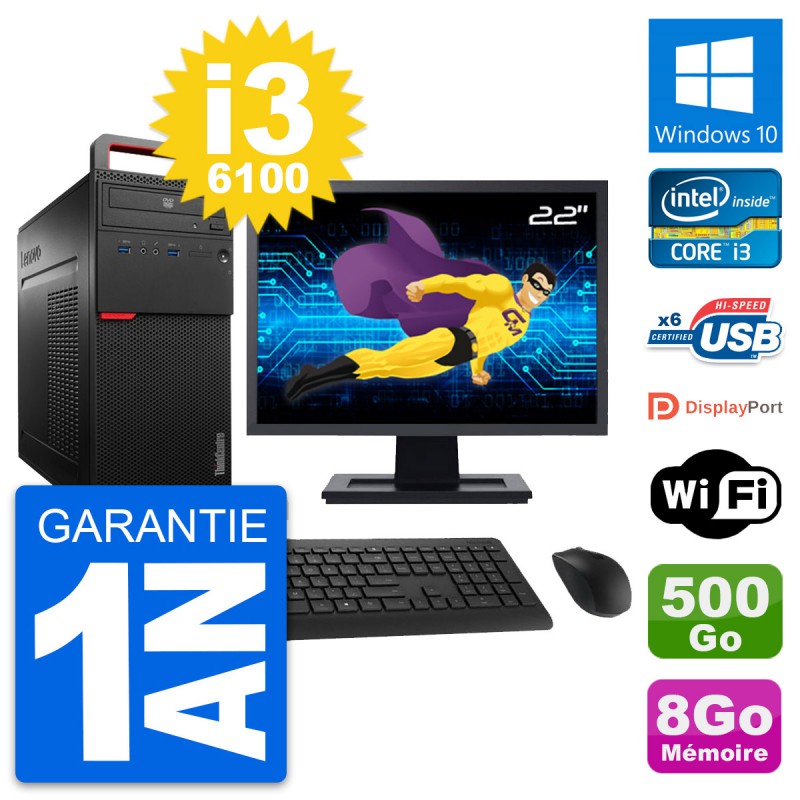 PC Tour Lenovo ThinkCentre M700 - Intel Core i3-6100 3.7 Ghz (3 Mo) - 8 Go DDR4 - Disque Dur 3,5" 500 Go - Graveur DVD - Clef Wifi USB - Windows 10 - Livré avec Ecran 22" + clavier + souris (Marques et modèles variables) - Garantie 1 an.