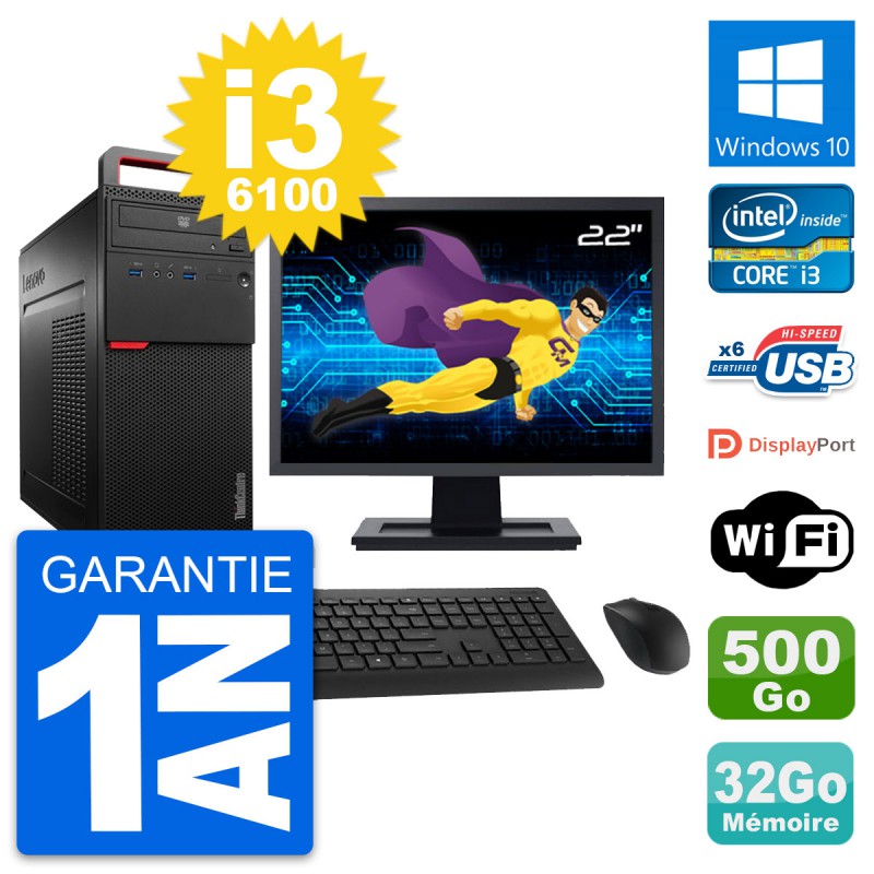 PC Tour Lenovo ThinkCentre M700 - Intel Core i3-6100 3.7 Ghz (3 Mo) - 32 Go DDR4 - Disque Dur 3,5" 500 Go - Graveur DVD - Clef Wifi USB - Windows 10 - Livré avec Ecran 22" + clavier + souris (Marques et modèles variables) - Garantie 1 an.