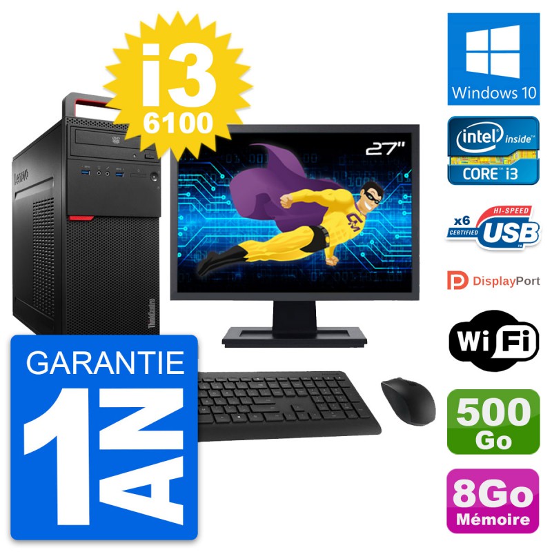 PC Tour Lenovo ThinkCentre M700 - Intel Core i3-6100 3.7 Ghz (3 Mo) - 8 Go DDR4 - Disque Dur 3,5" 500 Go - Graveur DVD - Clef Wifi USB - Windows 10 - Livré avec Ecran 27" + clavier + souris (Marques et modèles variables) - Garantie 1 an.