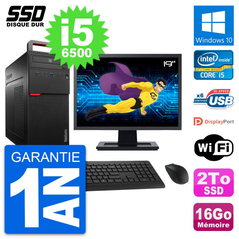 PC Tour Lenovo ThinkCentre M700 - Intel Core i5-6500 3.2 Ghz (6 Mo) - 16 Go DDR4 - SSD 2 To - Graveur DVD - Clef Wifi USB - Windows 10 - Livré avec Ecran 19" + clavier + souris (Marques et modèles variables) - Garantie 1 an.