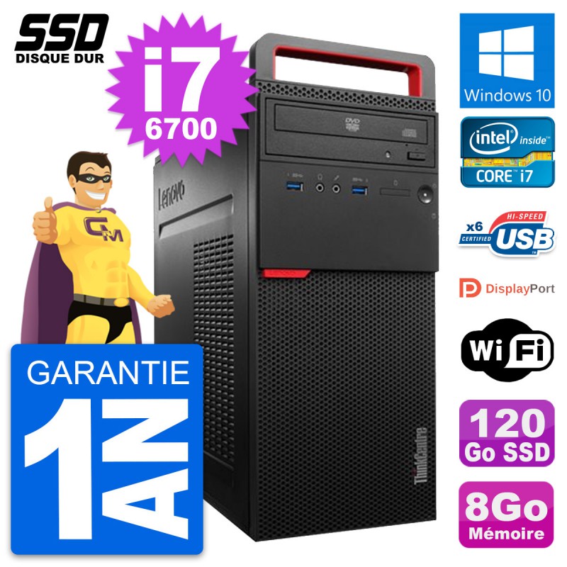PC Tour Lenovo ThinkCentre M700 - Intel Core i7-6700 3.4 Ghz (8 Mo) - 8 Go DDR4 - SSD 120 Go - Graveur DVD - Clef Wifi USB - Windows 10 - Garantie 1 an.