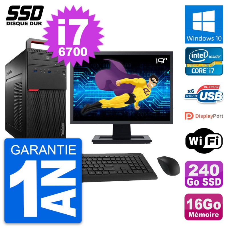PC Tour Lenovo ThinkCentre M700 - Intel Core i7-6700 3.4 Ghz (8 Mo) - 16 Go DDR4 - SSD 240 Go - Graveur DVD - Clef Wifi USB - Windows 10 - Livré avec Ecran 19" + clavier + souris (Marques et modèles variables) - Garantie 1 an.
