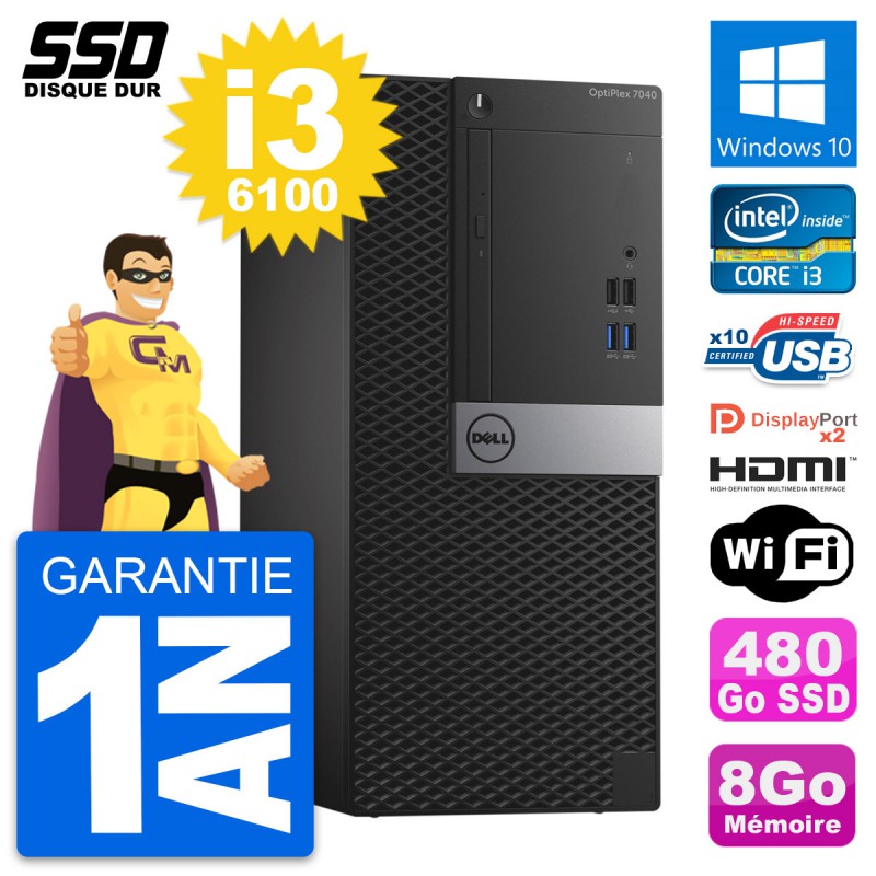 PC Tour Dell OptiPlex 7040 MT - Intel Core i3-6100 3.7 Ghz (3 Mo) - 8 Go DDR4 - SSD 480 Go - Clef Wifi USB - Graveur DVD - Windows 10 - Garantie 1 an.