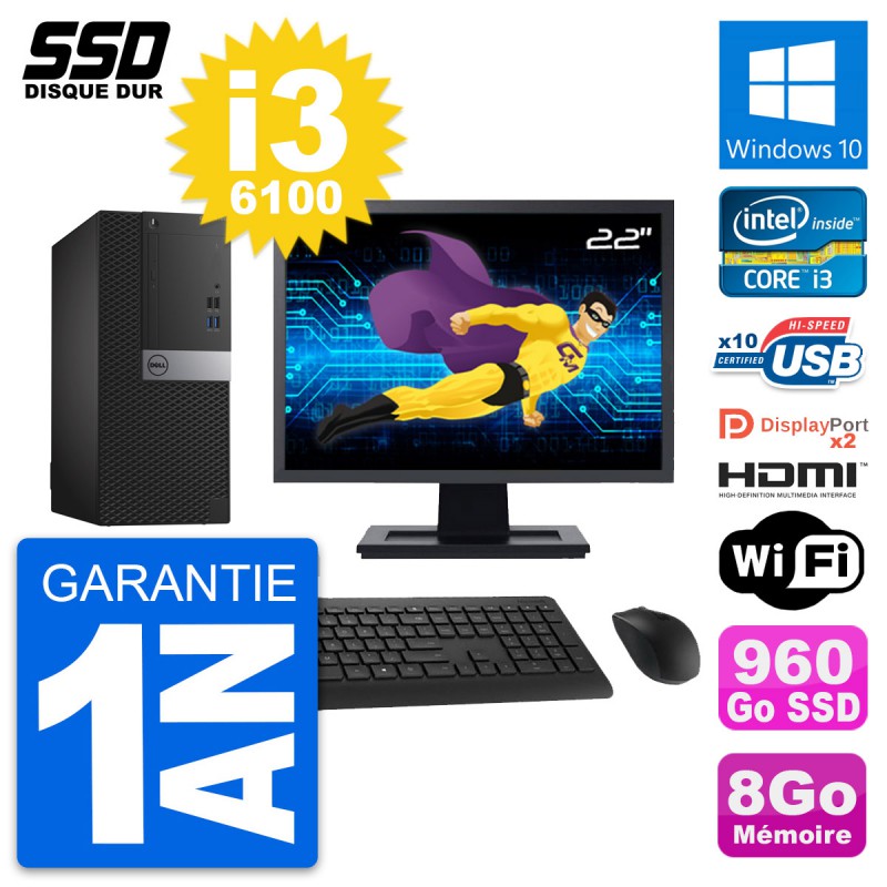PC Tour Dell OptiPlex 7040 MT - Intel Core i3-6100 3.7 Ghz (3 Mo) - 8 Go DDR4 - SSD 960 Go - Clef Wifi USB - Graveur DVD - Windows 10 - Livré avec Ecran 22" + clavier + souris (Marques et modèles variables) - Garantie 1 an.