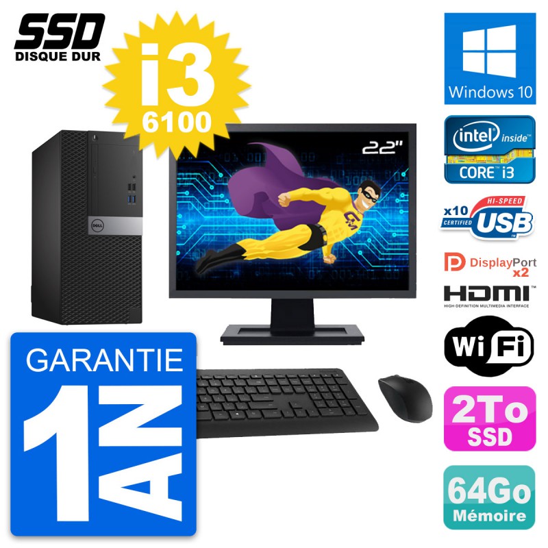 PC Tour Dell OptiPlex 7040 MT - Intel Core i3-6100 3.7 Ghz (3 Mo) - 64 Go DDR4 - SSD 2 To - Clef Wifi USB - Graveur DVD - Windows 10 - Livré avec Ecran 22" + clavier + souris (Marques et modèles variables) - Garantie 1 an.