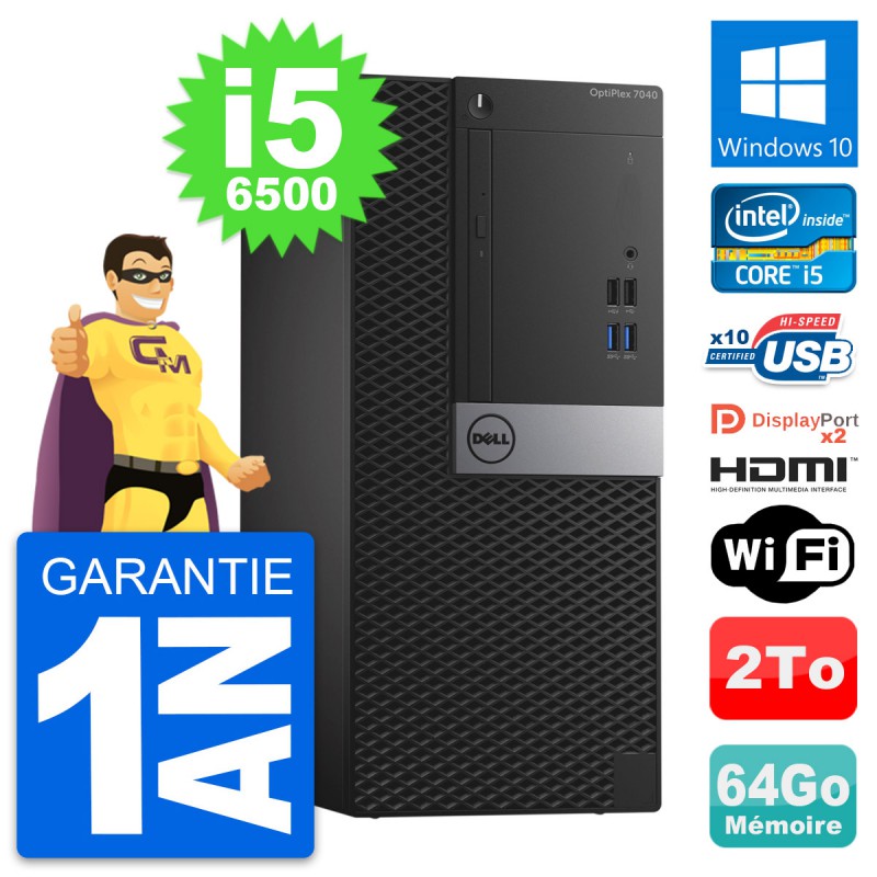 PC Tour Dell OptiPlex 7040 MT - Intel Core i5-6500 3.2 Ghz (6 Mo) - 64 Go DDR4 - Disque Dur 3,5" 2 To - Clef Wifi USB - Graveur DVD - Windows 10 - Garantie 1 an.