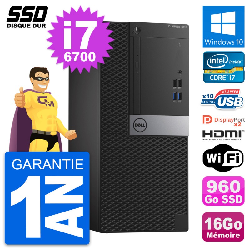 PC Tour Dell OptiPlex 7040 MT - Intel Core i7-6700 3.4 Ghz (8 Mo) - 16 Go DDR4 - SSD 960 Go - Clef Wifi USB - Graveur DVD - Windows 10 - Garantie 1 an.