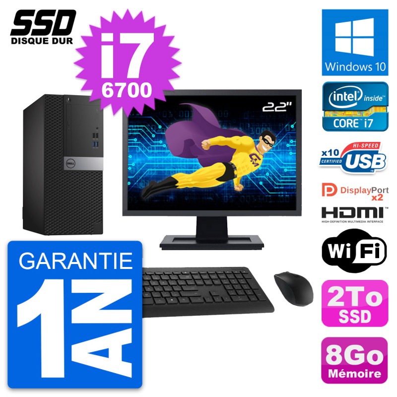 PC Tour Dell OptiPlex 7040 MT - Intel Core i7-6700 3.4 Ghz (8 Mo) - 8 Go DDR4 - SSD 2 To - Clef Wifi USB - Graveur DVD - Windows 10 - Livré avec Ecran 22" + clavier + souris (Marques et modèles variables) - Garantie 1 an.