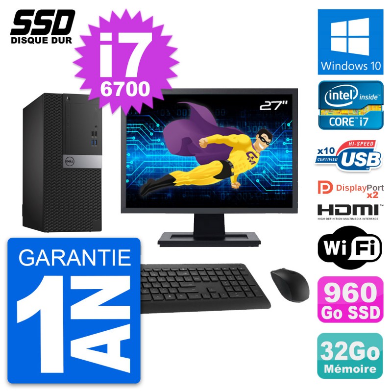 PC Tour Dell OptiPlex 7040 MT - Intel Core i7-6700 3.4 Ghz (8 Mo) - 32 Go DDR4 - SSD 960 Go - Clef Wifi USB - Graveur DVD - Windows 10 - Livré avec Ecran 27" + clavier + souris (Marques et modèles variables) - Garantie 1 an.