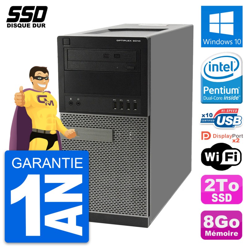 PC Tour Dell OptiPlex 9010 - Intel Pentium Dual-Core G630 2.7 Ghz (3 Mo) - 8 Go DDR3 - SSD 2 To - Graveur DVD - Clef Wifi USB - Windows 10 - Garantie 1 an.