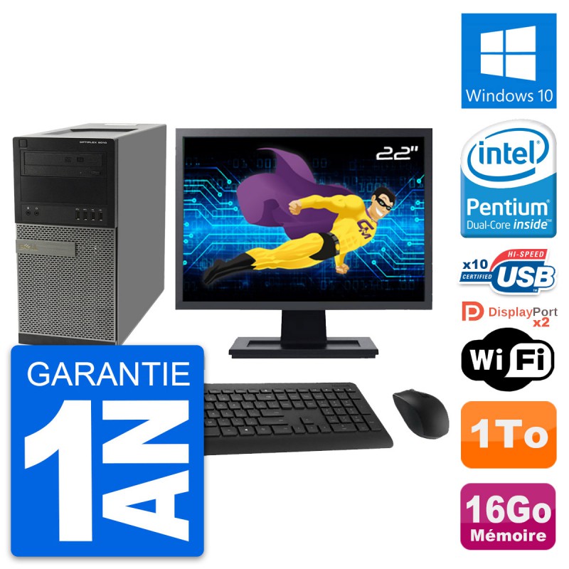 PC Tour Dell OptiPlex 9010 - Intel Pentium Dual-Core G630 2.7 Ghz (3 Mo) - 16 Go DDR3 - Disque Dur 3,5" 1 To - Graveur DVD - Clef Wifi USB - Windows 10 - Livré avec Ecran 22" + clavier + souris (Marques et modèles variables) - Garantie 1 an.
