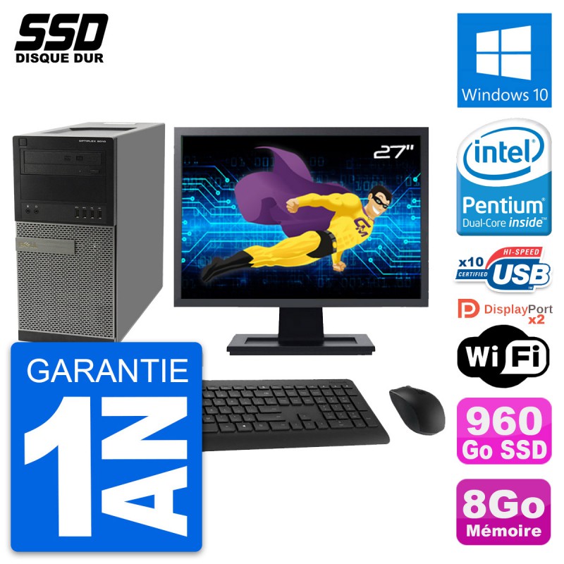 PC Tour Dell OptiPlex 9010 - Intel Pentium Dual-Core G630 2.7 Ghz (3 Mo) - 8 Go DDR3 - SSD 960 Go - Graveur DVD - Clef Wifi USB - Windows 10 - Livré avec Ecran 27" + clavier + souris (Marques et modèles variables) - Garantie 1 an.