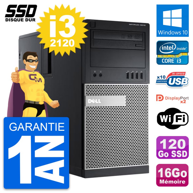 PC Tour Dell OptiPlex 9010 - Intel Core i3-2120 3.3 Ghz (3 Mo) - 16 Go DDR3 - SSD 120 Go - Graveur DVD - Clef Wifi USB - Windows 10 - Garantie 1 an.