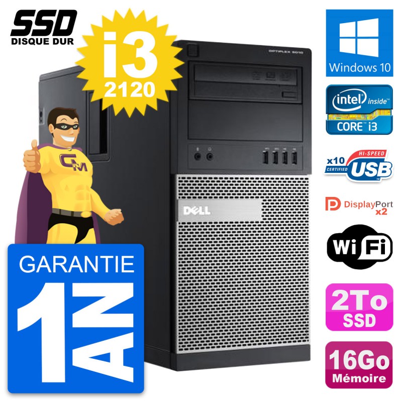 PC Tour Dell OptiPlex 9010 - Intel Core i3-2120 3.3 Ghz (3 Mo) - 16 Go DDR3 - SSD 2 To - Graveur DVD - Clef Wifi USB - Windows 10 - Garantie 1 an.