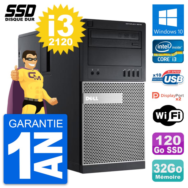 PC Tour Dell OptiPlex 9010 - Intel Core i3-2120 3.3 Ghz (3 Mo) - 32 Go DDR3 - SSD 120 Go - Graveur DVD - Clef Wifi USB - Windows 10 - Garantie 1 an.