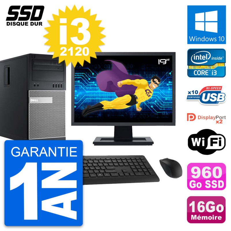PC Tour Dell OptiPlex 9010 - Intel Core i3-2120 3.3 Ghz (3 Mo) - 16 Go DDR3 - SSD 960 Go - Graveur DVD - Clef Wifi USB - Windows 10 - Livré avec Ecran 19" + clavier + souris (Marques et modèles variables) - Garantie 1 an.