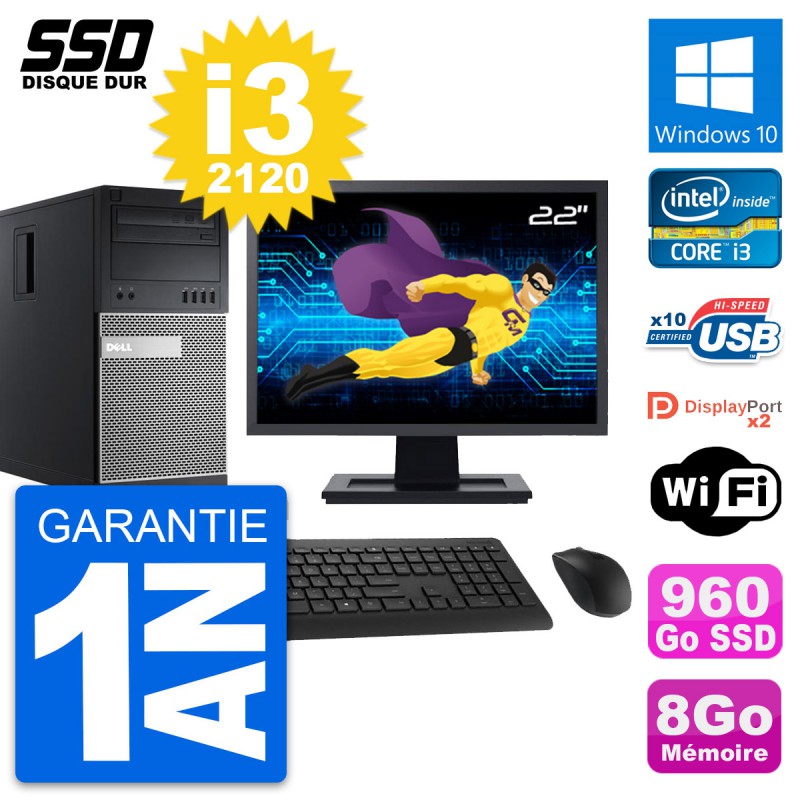 PC Tour Dell OptiPlex 9010 - Intel Core i3-2120 3.3 Ghz (3 Mo) - 8 Go DDR3 - SSD 960 Go - Graveur DVD - Clef Wifi USB - Windows 10 - Livré avec Ecran 22" + clavier + souris (Marques et modèles variables) - Garantie 1 an.