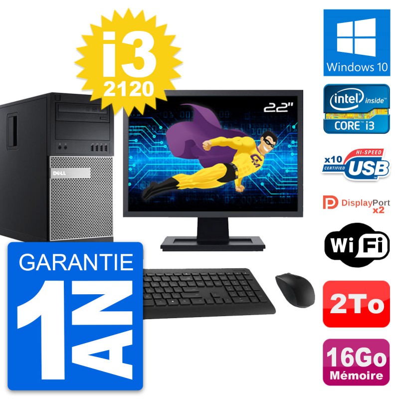 PC Tour Dell OptiPlex 9010 - Intel Core i3-2120 3.3 Ghz (3 Mo) - 16 Go DDR3 - Disque Dur 3,5" 2 To - Graveur DVD - Clef Wifi USB - Windows 10 - Livré avec Ecran 22" + clavier + souris (Marques et modèles variables) - Garantie 1 an.