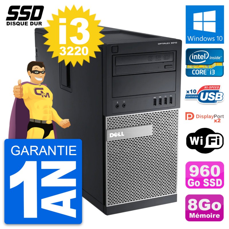 PC Tour Dell OptiPlex 9010 - Intel Core i3-3220 3.3 Ghz (3 Mo) - 8 Go DDR3 - SSD 960 Go - Graveur DVD - Clef Wifi USB - Windows 10 - Garantie 1 an.