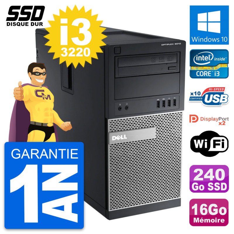 PC Tour Dell OptiPlex 9010 - Intel Core i3-3220 3.3 Ghz (3 Mo) - 16 Go DDR3 - SSD 240 Go - Graveur DVD - Clef Wifi USB - Windows 10 - Garantie 1 an.